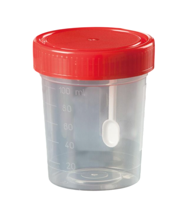 - Pot pour coprologie 120ml en polypropylène gradué cape à vis rouge avec spatule