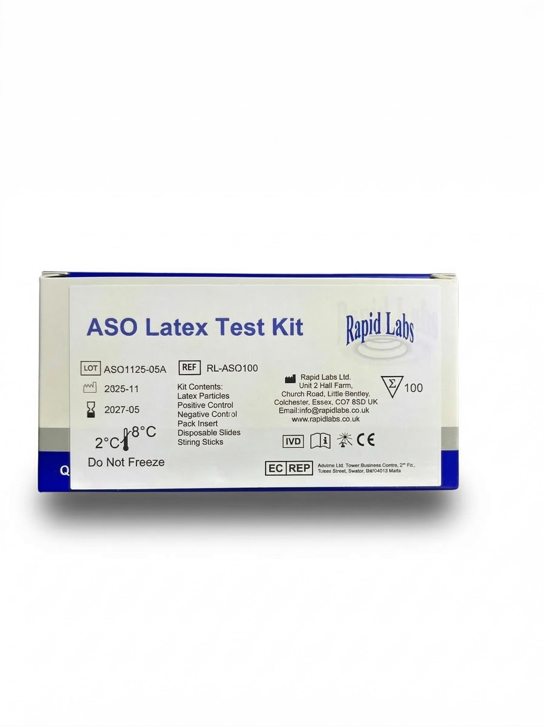 ASO-latex de Rapid Labs est un test d'agglutination glissière pour la détection qualitative et semi-quantitative de l'anti-streptolysine O (ASO) dans le sérum humain. Les particules de latex enrobées de streptolysine O (SLO) sont agglutinées lorsqu'elles sont mélangées à des échantillons contenant de l'ASO.