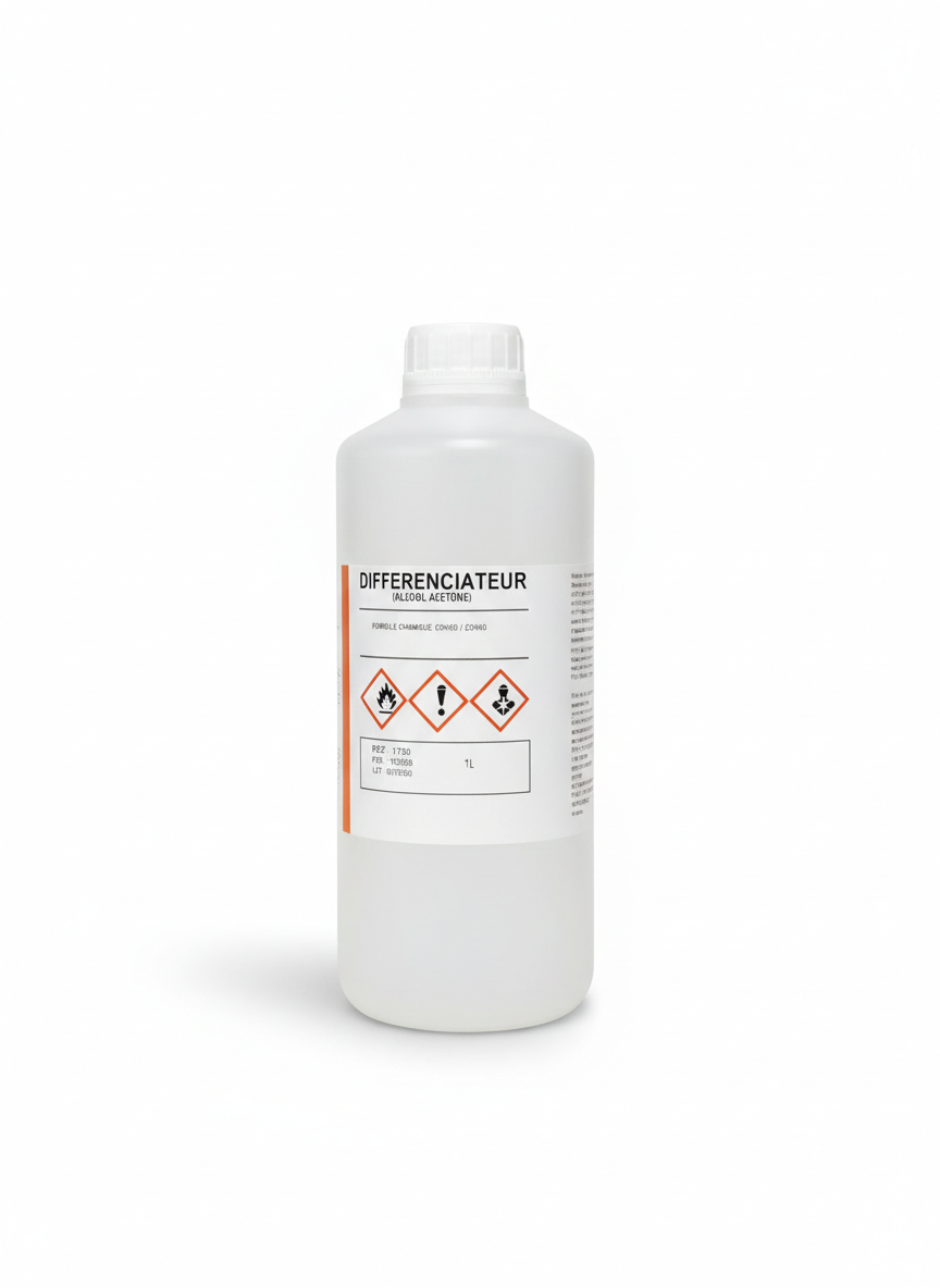 Le Différenciateur Alcool-Acétone est une solution solvante équilibrée utilisée lors de l'étape la plus délicate de la coloration de Gram : la décoloration. Son rôle est de tester la perméabilité de la paroi bactérienne après le mordançage au Lugol. Sur les bactéries à Gram négatif, riches en lipides, le mélange dissout la membrane externe et laisse échapper le complexe violet-iode. En revanche, il déshydrate le peptidoglycane épais des bactéries à Gram positif, emprisonnant le colorant à l'intérieur. Ce mélange est préféré à l'alcool pur car l'ajout d'acétone accélère le processus, offrant une différenciation plus tranchée et un gain de temps considérable lors des analyses en série.