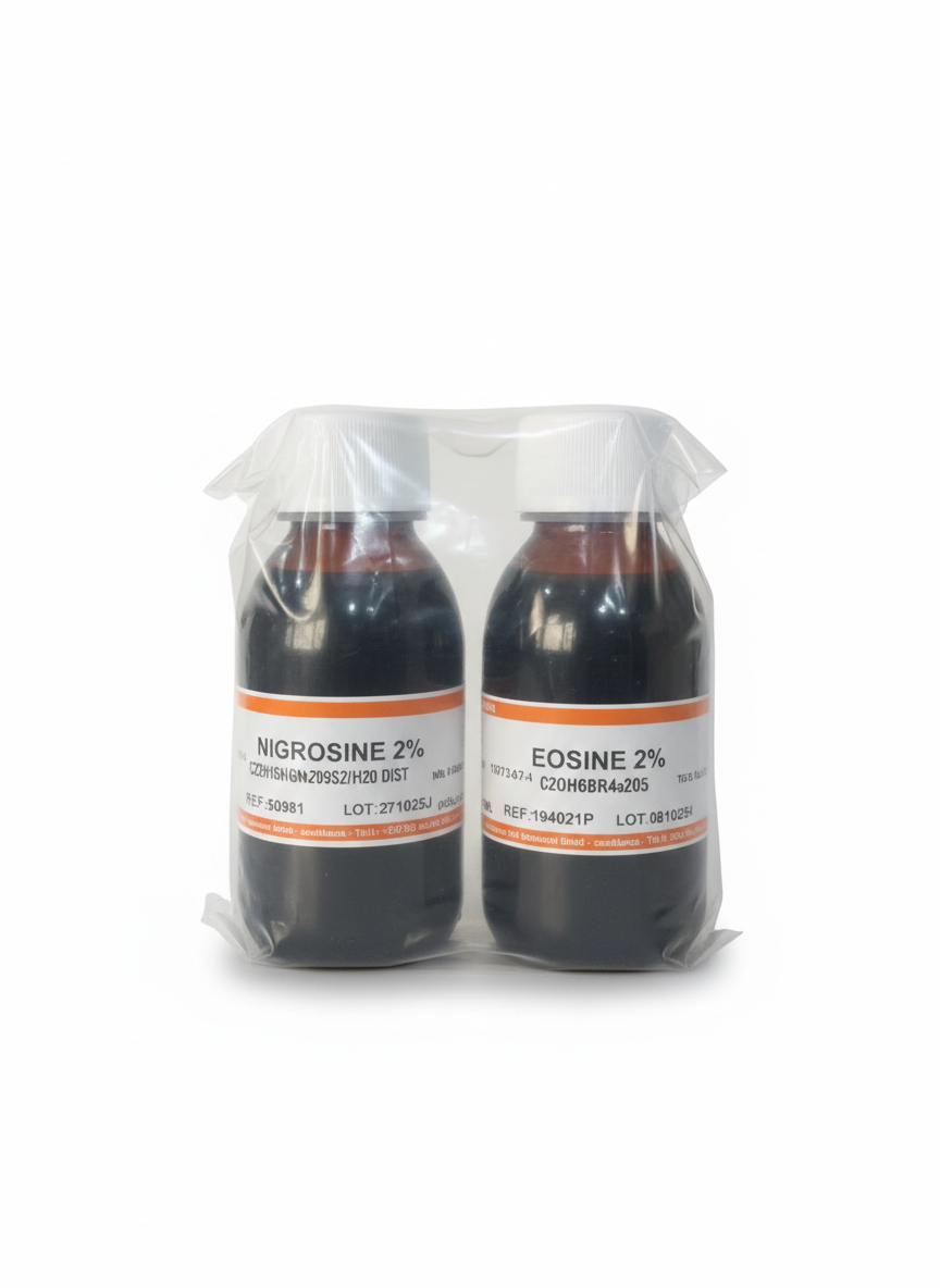 Le Kit Éosine-Nigrosine 2% Solvapur est un système de coloration vitale spécifiquement conçu pour l'analyse de la morphologie et de la vitalité des spermatozoïdes (spermogramme). Ce kit de 2 x 100 ml repose sur un principe de coloration négative : la Nigrosine offre un arrière-plan sombre et contrasté, tandis que l'Éosine pénètre uniquement les cellules dont la membrane est endommagée (cellules mortes), les colorant en rose/rouge. Les cellules vivantes, dont la membrane est intacte, restent blanches, permettant une distinction rapide et précise sous microscope pour un diagnostic de fertilité fiable.