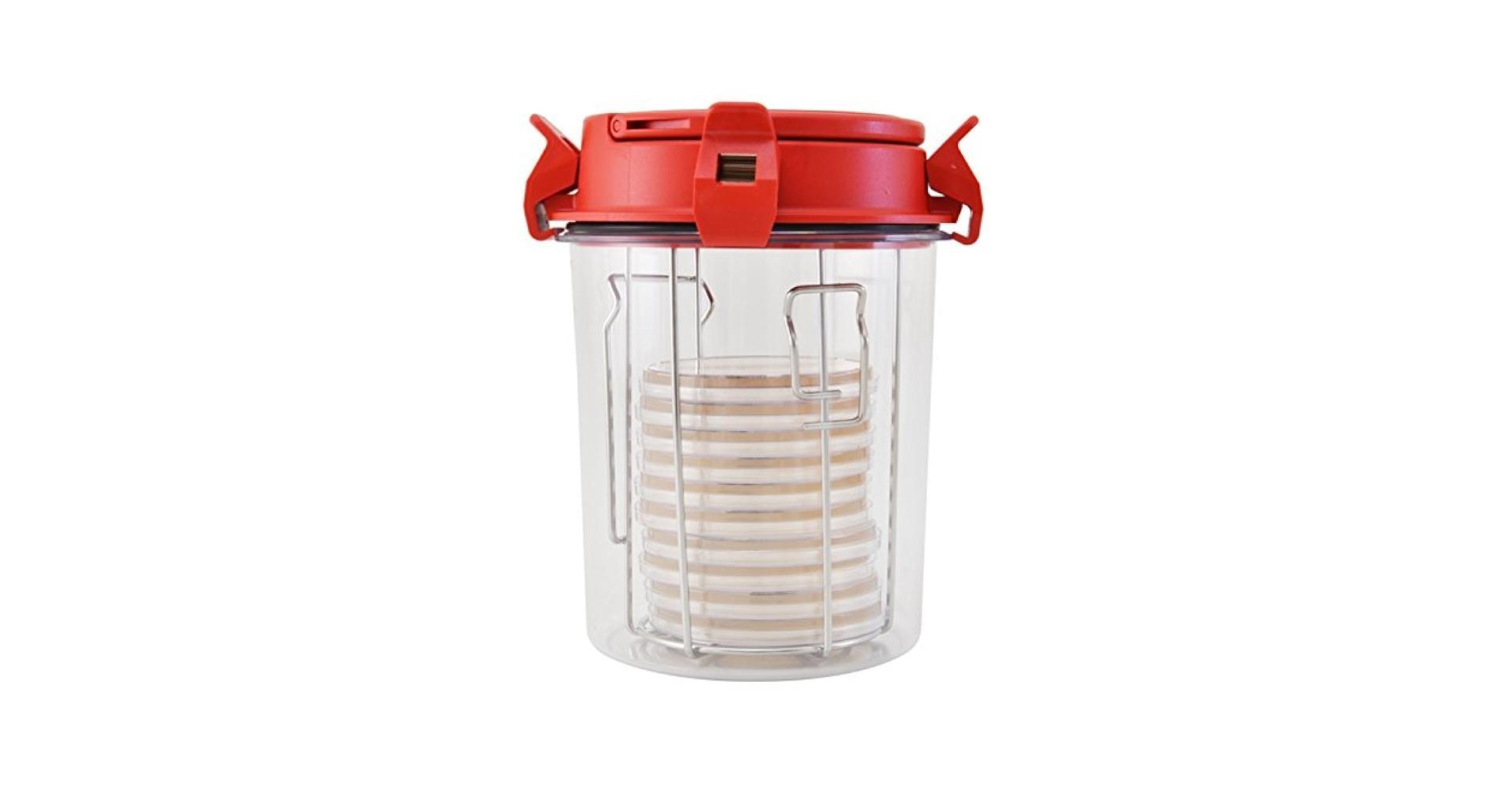 La cuve AnaeroJar de 2,5 L est livrée avec une base de cuve en polycarbonate d’une capacité de 2,5 L et un couvercle fixé à la base par quatre clips auto-ventilés.