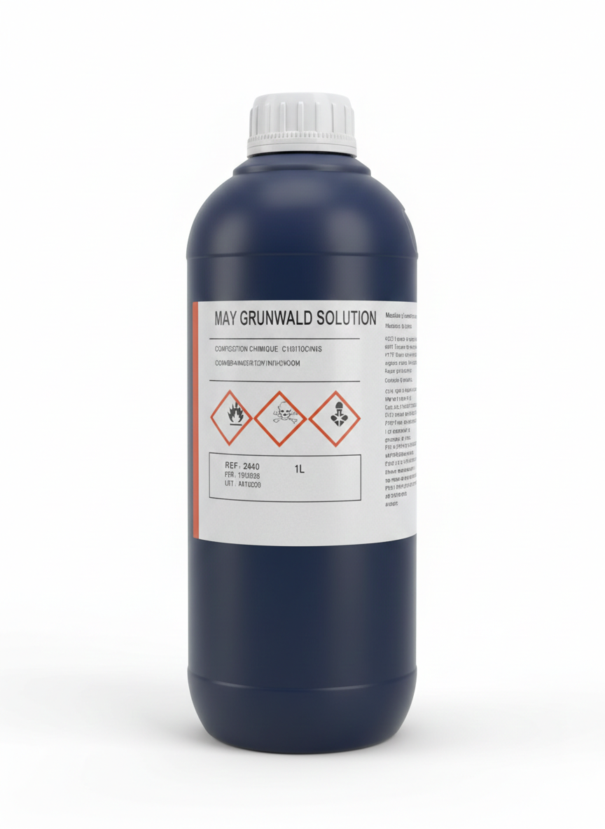 La Solution de May-Grünwald est un colorant histologique composé d'un mélange d'éosine et de bleu de méthylène dissous dans du méthanol. Utilisée principalement pour la réalisation de frottis sanguins et médullaires, elle constitue la première étape de la coloration de May-Grünwald Giemsa (MGG). Son rôle est double : le méthanol assure la fixation chimique des cellules, tandis que les colorants révèlent avec finesse les détails acides et basiques des composants cellulaires. Elle est particulièrement efficace pour mettre en évidence les granulations des polynucléaires et les nuances du cytoplasme, permettant ainsi une identification précise des différentes lignées de leucocytes.