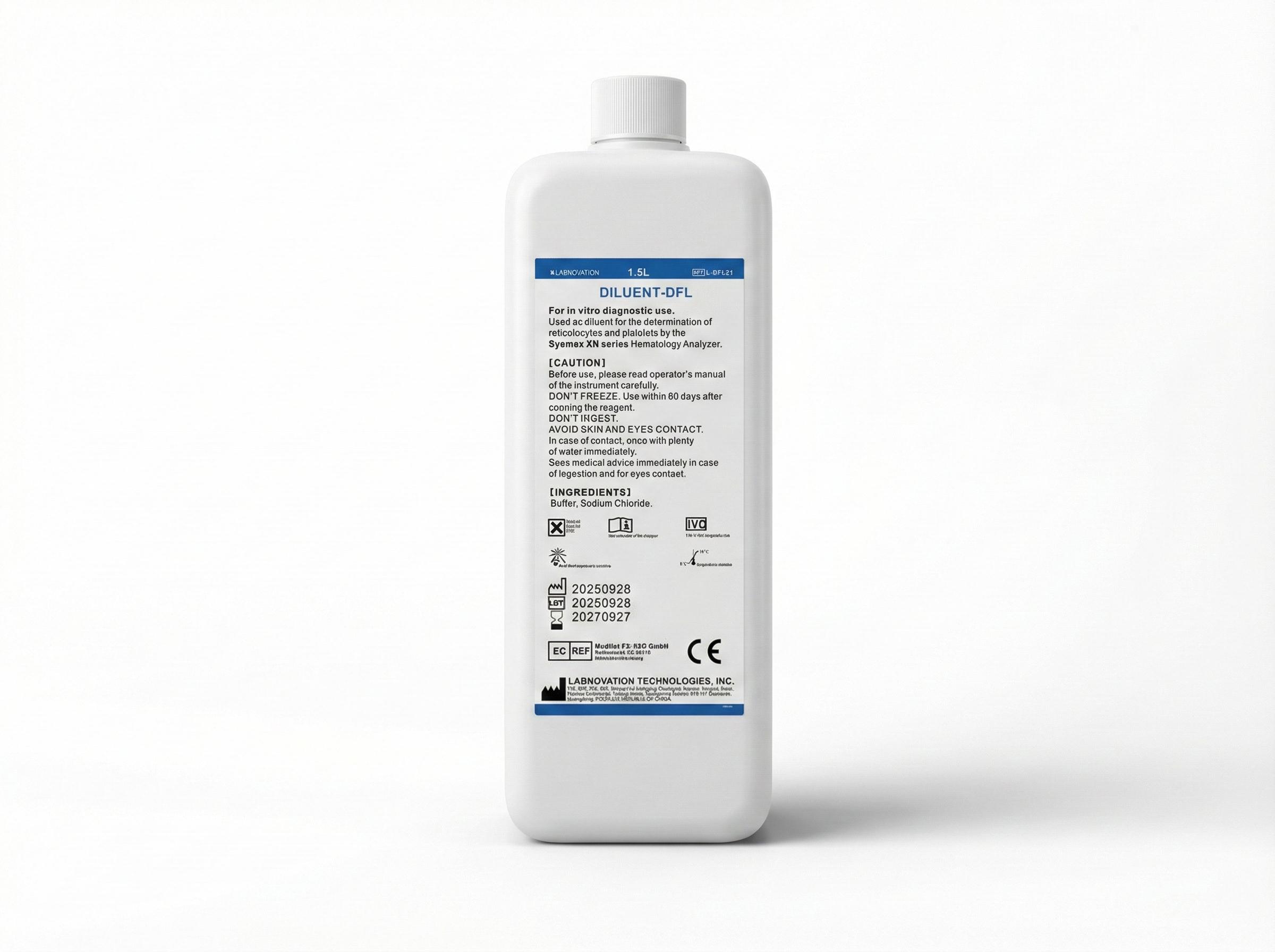 DILUENT-DFL, est utilisé comme diluant pour la détermination des réticulocytes et des plaquettes par l'analyseur d'hématologie automatique Sysmex.